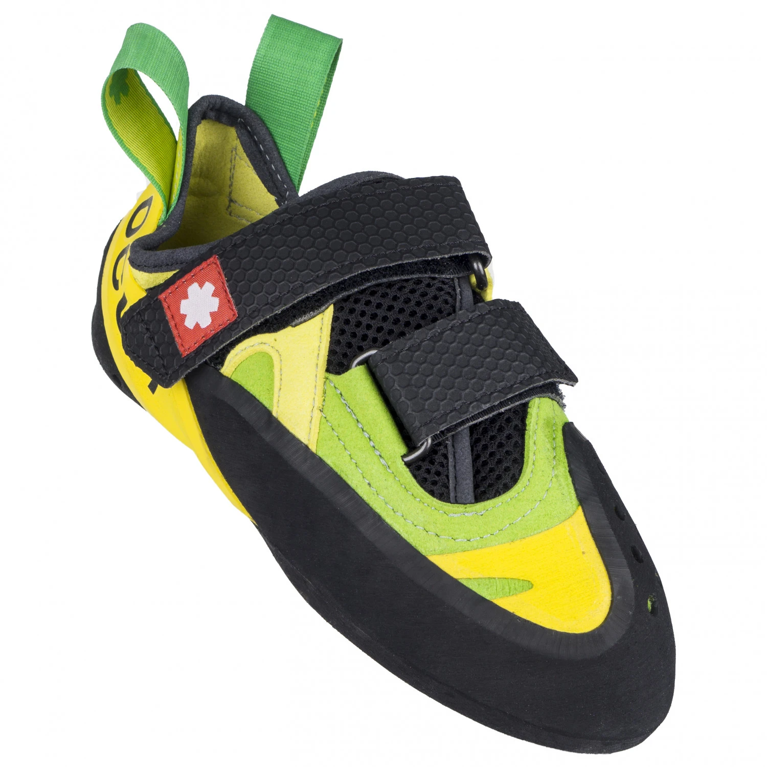 The perfect climbing shoes for new and ambitious projects – the Ocun Oxi QC! These climbing shoes come with hook and loop fasteners, which make the shoes very easy to slip on and off. Plus, they allow for quite the precise fit! The very asymmetrical shape and high heel tension will give you the stability you need on super-small footholds and overhangs. Thanks to the rubberised toe box and heel, technical toe and heel hooks will be a breeze. The two-piece tongue makes putting on the shoes easier, and the mesh will provide moisture transfer.
